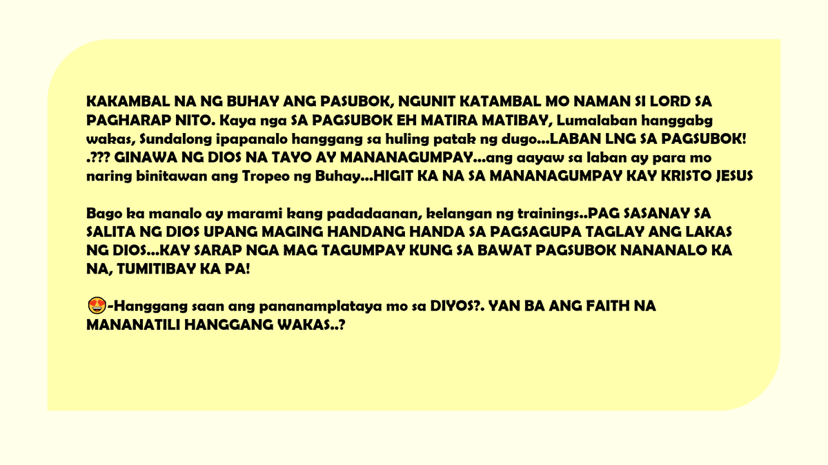 2 Ito ay sapagkat sa hatol na inyong ihahatol ay hahatulan kayo. Tiniis Ko ang iyong mga kalungkutan dinanas Ko ang iyong mga pakikipagpunyagi at sinagupa Ko ang iyong mga. Hini ata tama yan.