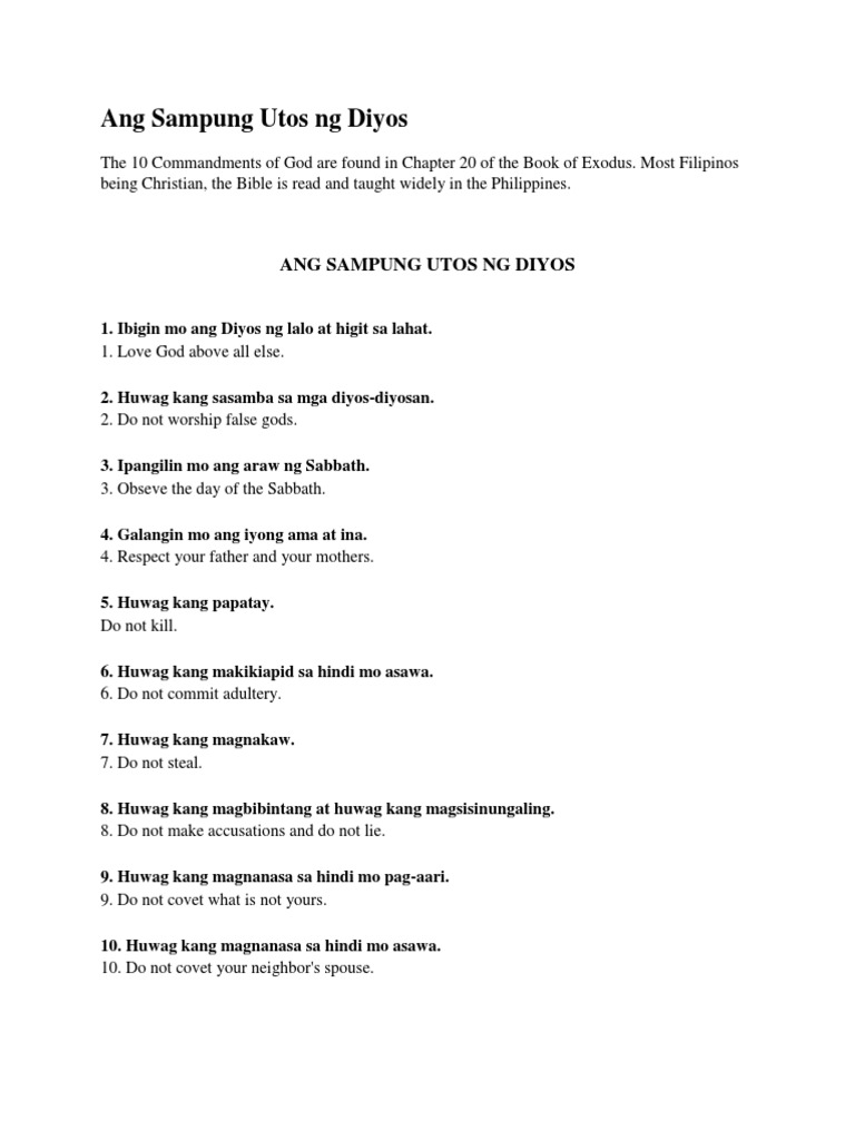 Huwag kang magbibintang at huwag kang. Respect your father and your mothers. Huwag kang magnasa sa hindi mo asawa.