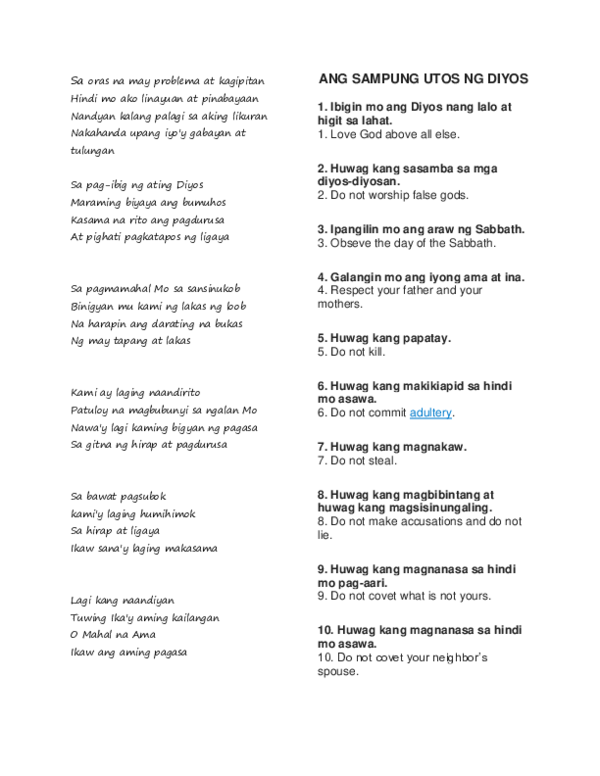 10 COMMANDMENTS OF GOD TAGALOG1 Ibigin mo ang Diyos nang lalo at higit sa lahat2 Huwag kang sasamba sa mga diyos-diyosan3 Ipangilin mo ang araw ng Sabbath4 Galangin mo ang iyong ama at ina5 Huwag kang papatay6 Huwag kang makikiapid sa hindi mo asawa7 Huwag kang magnakaw8 Huwag kang magbibintang at huwag kang magsisinungaling. Do not make accusations and do not lie. Ipangilin mo ang araw ng Pangilin.